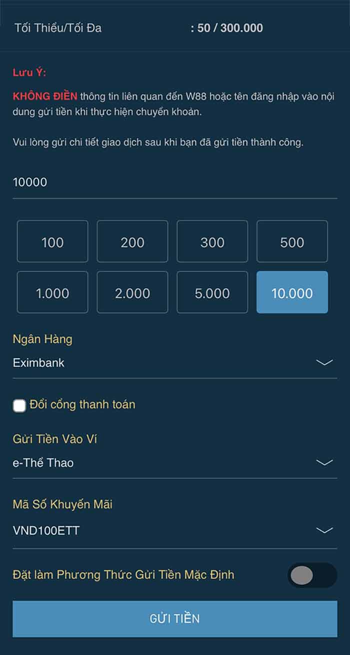 Đơn vị tiền VND tại W88, sẽ bỏ bớt 3 số “0” ở sau, ví dụ người chơi gửi tiền vào W88: 10.000.000 VND, thì khi nhập tiền gửi ==> “10.000”.