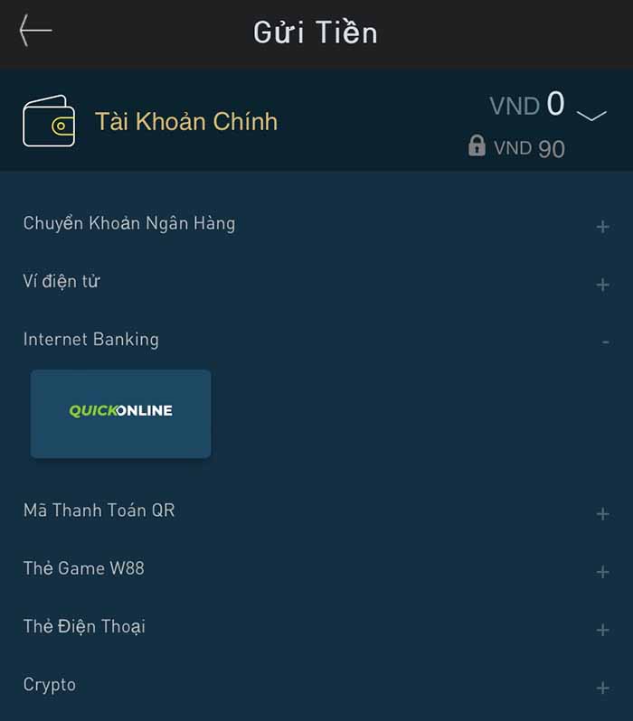 Người chơi truy cập link W88 và chọn “đăng nhập w88”. Tiếp đến người chơi nhấp vào biểu tượng “ gửi tiền” và chọn “ chuyển khoản online”==> “ Quick Online”.