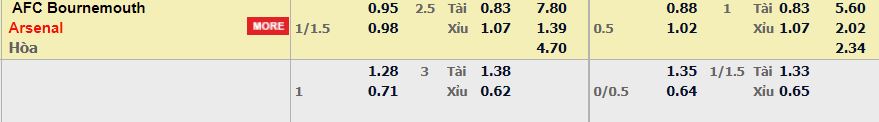 - Mức kèo nhà cái cược chấp trận này: Arsenal chấp 1,25 Trái. Bournemouth ăn 0,95. Arsenal ăn 0,98