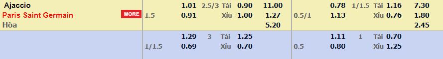 - Mức kèo nhà cái cược chấp trận này: Paris SG chấp 1,5 trái. Ajaccio ăn 1,01. Paris SG ăn 0,91
