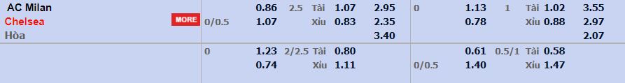 - Mức kèo nhà cái cược chấp trận này: Chelsea chấp 0,25 trái. AC Milan ăn 0,86. Chelsea ăn 1,07