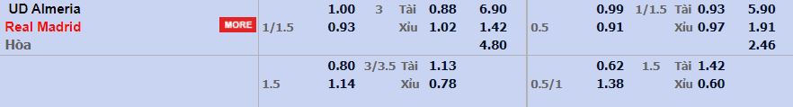 - Mức kèo nhà cái Fun88 cược chấp trận này: Real Madrid chấp 1,25 Trái. Almeria ăn 1,00. Real Madrid ăn 0,93
