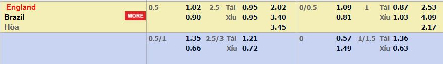 - Mức kèo nhà cái cược chấp trận này: Anh chấp 0,5 trái. Anh ăn 1,02. Brazil ăn 0,90