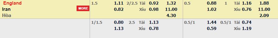 - Mức kèo nhà cái cược chấp trận này: Anh chấp 1,5 trái. Anh ăn 1,11. Iran ăn 0,82