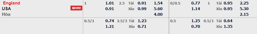 - Mức kèo nhà cái cược chấp trận này: Anh chấp 1 trái. Anh ăn 1,01. Mỹ ăn 0,91
