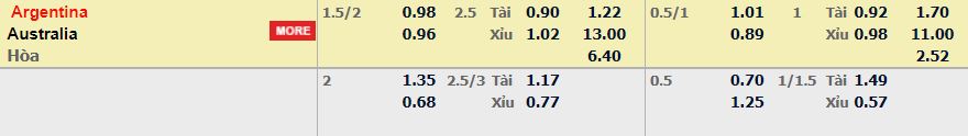 - Mức kèo nhà cái cược chấp trận này: Argentina chấp 1,75 Trái. Argentina ăn 0,98. Australia ăn 0,96