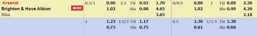 - Mức kèo nhà cái cược chấp trận này: Arsenal chấp 0,75 trái. Arsenal ăn 0,90. Brighton ăn 1,02
