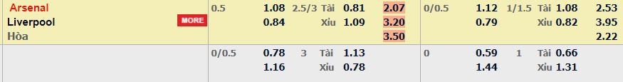 - Mức kèo nhà cái cược chấp trận này: Arsenal chấp 0,5 Trái. Arsenal ăn 1,08. Liverpool ăn 0,84