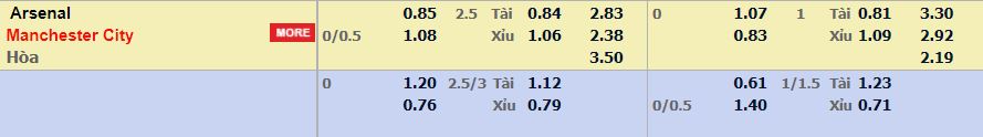 - Mức kèo nhà cái cược chấp trận này: Manchester City chấp 0,25 Trái. Arsenal ăn 0,85. Manchester City ăn 1,08