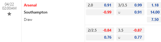 Tỷ lệ kèo bóng đá Arsenal vs Southampton – 02h00 – 22/04/2023
