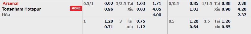 - Mức kèo nhà cái cược chấp trận này: Arsenal chấp 0,75 Trái. Arsenal ăn 0,92. Tottenham ăn 0,96