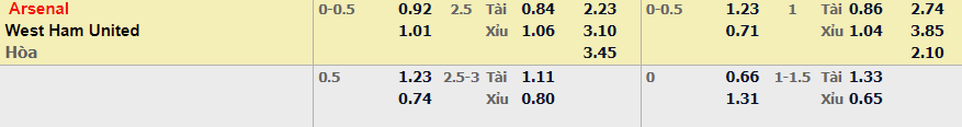 - Mức kèo nhà cái cược chấp trận này: Arsenal chấp 0,25 Trái. Arsenal ăn 0,92. West Ham ăn 1,01