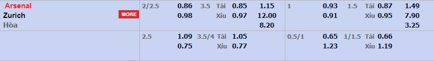- Mức kèo nhà cái cược chấp trận này: Arsenal chấp 2,25 trái. Arsenal ăn 0,86. Zurich ăn 0,98