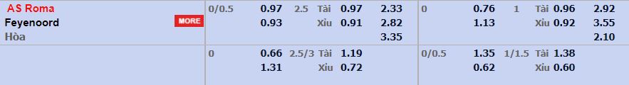 - Mức kèo nhà cái cược chấp trận này: AS Roma chấp 0,25 Trái. AS Roma ăn 0,97. Feyenoord ăn 0,93