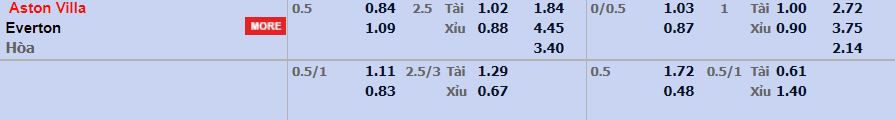- Mức kèo nhà cái V9bet cược chấp trận này: Aston Villa chấp 0,5 Trái. Aston Villa ăn 0,84. Everton ăn 1,09