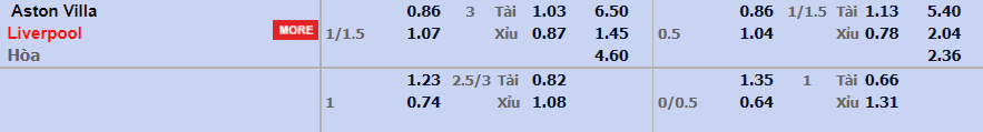 - Mức kèo nhà cái cược chấp trận này: Liverpool chấp 1,75 Trái. Aston Villa ăn 0,86. Liverpool ăn 1,07
