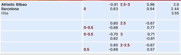 - Mức kèo nhà cái cược chấp trận này: Hòa – Được – Thua. Ath Bilbao ăn 1,00. Barcelona ăn 0,83