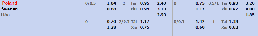 - Mức kèo nhà cái cược chấp trận này: Ba Lan chấp 0,25 Trái. Ba Lan ăn 1,04. Thụy Điển ăn 0,88