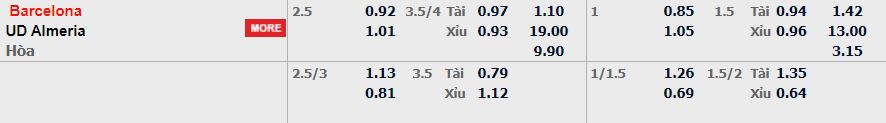 - Mức kèo nhà cái cược chấp trận này: Barcelona chấp 2,5 trái. Barcelona ăn 0,92. Almeria ăn 1,01