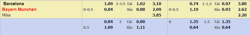 - Mức kèo nhà cái đưa ra trận này: Bayern Munich chấp 0,25 Trái. Barcelona ăn 1,09. Bayern Munich ăn 0,84