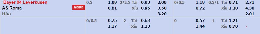 - Mức kèo nhà cái cược chấp trận này: Leverkusen chấp 0,5 Trái. Leverkusen ăn 1,09. AS Roma ăn 0,81
