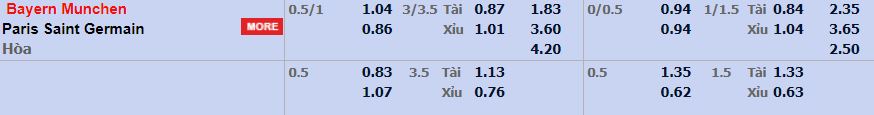 - Mức kèo nhà cái cược chấp trận này: Bayern Munich chấp 0,75 Trái. Bayern Munich ăn 1,04. Paris SG ăn 0,86