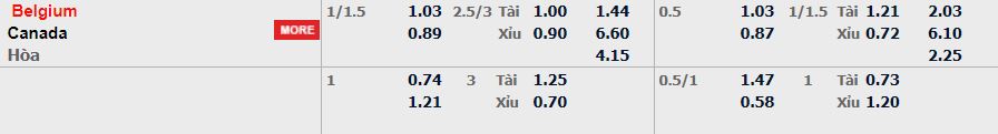 - Mức kèo nhà cái cược chấp trận này: Bỉ chấp 1,25 trái. Bỉ ăn 1,03. Canada ăn 0,89