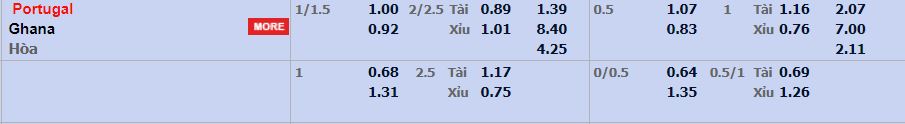 - Mức kèo nhà cái cược chấp trận này: Bồ Đào Nha chấp 1,25 trái. Bồ Đào Nha ăn 1,00. Ghana ăn 0,92