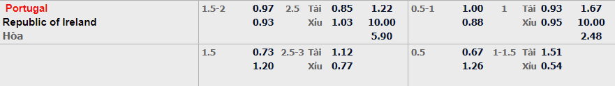 - Mức kèo nhà cái đưa ra trận này: Bồ Đào Nha chấp 1,75 Trái. Bồ Đào Nha ăn 0,97. Ireland ăn 0,93