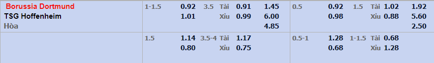 - Mức kèo nhà cái, tỷ lệ kèo bóng đá cược chấp trận này: Borussia Dortmunnd chấp 1,25 Trái. Borussia Dortmund ăn 0,92. Hoffenheim ăn 1,01