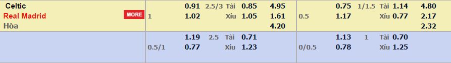- Mức kèo nhà cái Vn88 cược chấp trận này: Real Madrid chấp 1 Trái. Celtic ăn 0,91. Real Madrid ăn 1,02