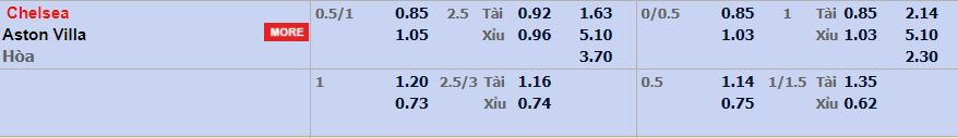 - Mức kèo nhà cái cược chấp trận này: Chelsea chấp 0,75 Trái. Chelsea ăn 0,85. Aston Villa ăn 1,05