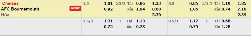 - Mức kèo nhà cái cược chấp trận này: Chelsea chấp 1,5 Trái. Chelsea ăn 1,01. Bournemouth ăn 0,92