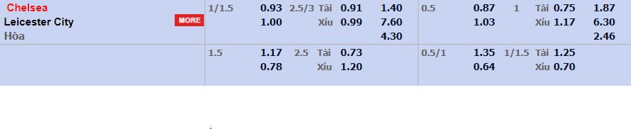 - Mức kèo nhà cái cược chấp trận này: Chelsea chấp 1,25 Trái. Chelsea ăn 0,93. Leicester City ăn 1,00