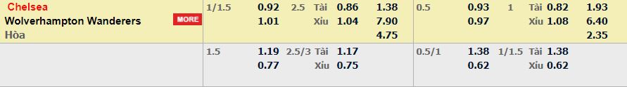 - Mức kèo nhà cái cược chấp trận này: Chelsea chấp 1,25 Trái. Chelsea ăn 0,92. Wolves ăn 1,01