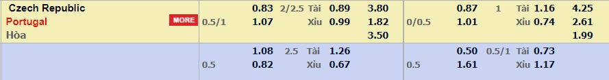 - Mức kèo nhà cái cược chấp trận này: Bồ Đào Nha chấp 0,75 Trái. Cộng hòa Séc ăn 0,83. Bồ Đào Nha ăn 1,07