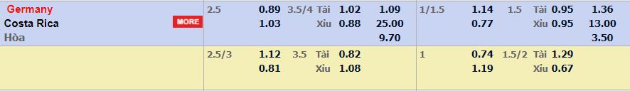 - Mức kèo nhà cái cược chấp trận này: Đức chấp 2,5 Trái. Đức ăn 0,89. Costa Rica ăn 1,03