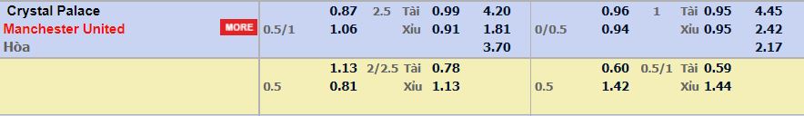 - Mức kèo nhà cái cược chấp trận này: Man Utd chấp 0,75 Trái. Crystal Palace ăn 0,87. Manchester Utd ăn 1,06