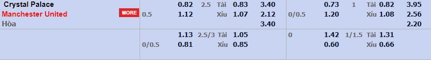 - Mức kèo nhà cái Fun88 cược chấp trận này: Man Utd chấp 0,5 Trái. Crystal Palace ăn 0,82. Man Utd ăn 1,12