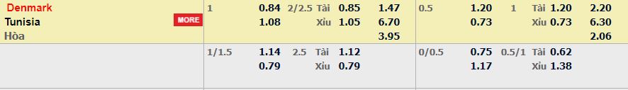 - Mức kèo nhà cái cược chấp trận này: Đan Mạch chấp 1 trái. Đan Mạch ăn 0,84. Tunisia ăn 1,08