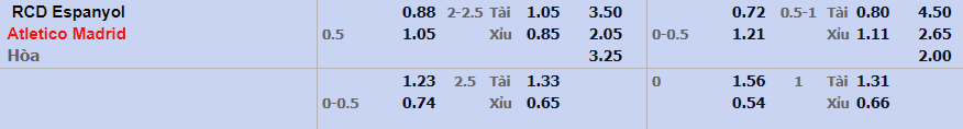 - Mức kèo nhà cái cược chấp trận này: Atl Madrid chấp 0,5 Trái. Espanyol ăn 0,88. Atl Madrid ăn 1,05