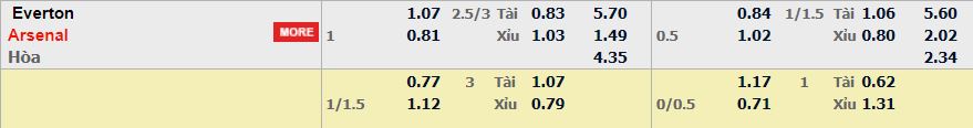 - Mức kèo nhà cái cược chấp trận này: Arsenal chấp 1 Trái. Everton ăn 1,07. Arsenal ăn 0,81
