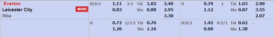 - Mức kèo nhà cái cược chấp trận này: Everton chấp 0,25 trái. Everton ăn 1,11. Leicester City ăn 0,83
