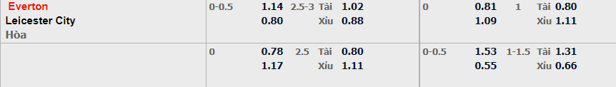 - Mức kèo nhà cái cược chấp trận này: Everton chấp 0,25 Trái. Everton ăn 1,14. Leicester City ăn 0,80
