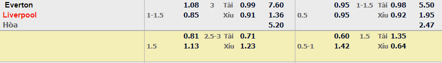 - Mức kèo nhà cái cược chấp trận này: Liverpool chấp 1,25 Trái. Everton ăn 1,08. Liverpool ăn 0,85