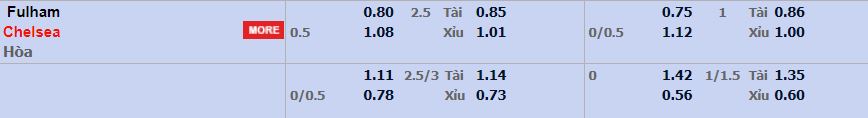 - Mức kèo nhà cái cược chấp trận này: Chelsea chấp 0,5 Trái. Fulham ăn 0,80. Chelsea ăn 1,08
