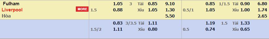 - Mức kèo nhà cái W88 ra mức cược chấp trận này: Liverpool chấp 1,5 Trái. Fulham ăn 1,05. Liverpool ăn 0,88