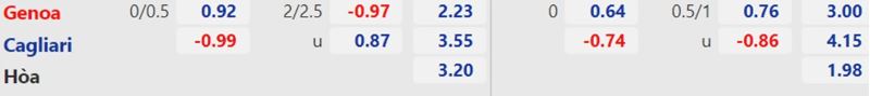 - Mức kèo nhà cái cược chấp trận này: Genoa chấp 0,25 trái. Genoa ăn 0,92. Cagliari ăn 1,00