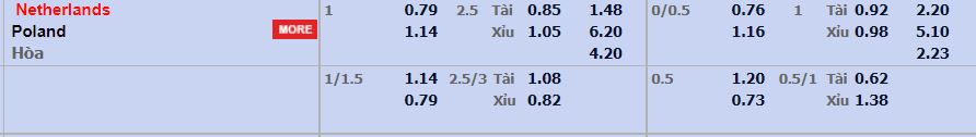 - Mức kèo nhà cái cược chấp trận này: Hà Lan chấp 1 Trái. Hà Lan ăn 0,79. Ba Lan ăn 1,14