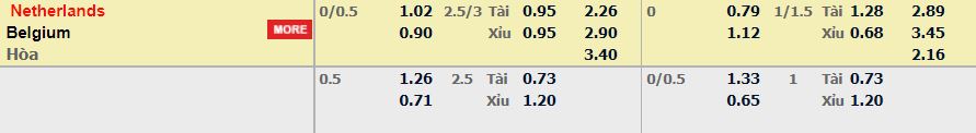 - Mức kèo nhà cái cược chấp trận này: Hà Lan chấp 0,25 Trái. Hà Lan ăn 1,02. Bỉ ăn 0,90